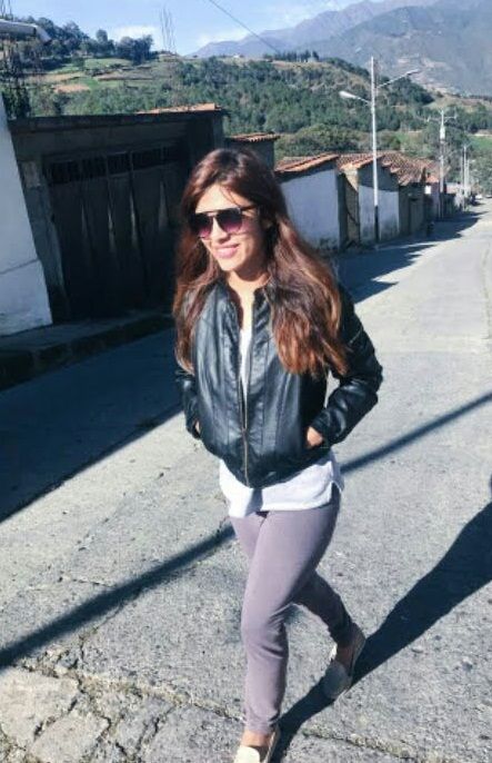 En esta foto llevo puesta una cazadora negra, lentes negros, leguins y blusa gris con unos zapatos dorados sencillos.