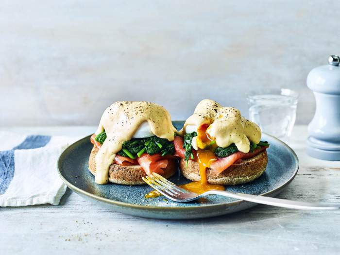 Lay the smoked salmon of top of the muffin halves then top with the spinach and the poached eggs. Spoon over the sauce and serve.