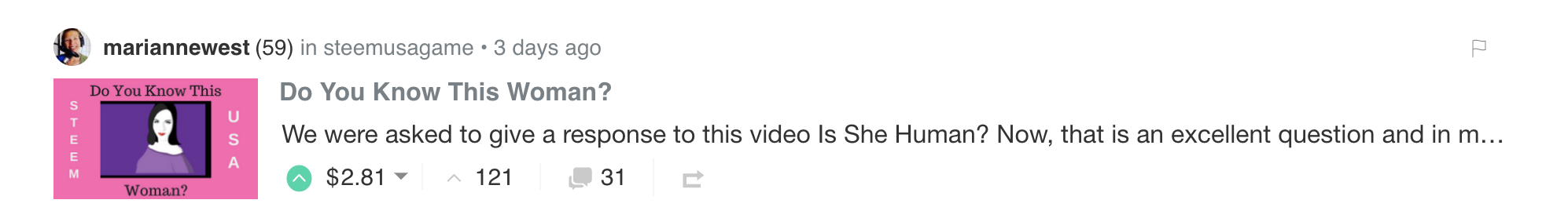 Oh thank you!! Steemusa is an amazing group of people. You are all so supportive, wonderful and I have recently learned how fun everyone is! Congrats to @mineopoly and @mariannewest. I really enjoyed reading their post :)