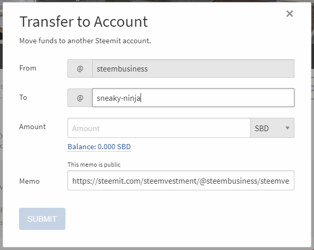 To receive an Upvote from @Sneaky-Ninja you have to transfer any amount of SBD to the Ninja including the Posts URL in the Memo that shall be upvoted. After that´s done you just got to wait for some time until you receive the Vote from the Bot.