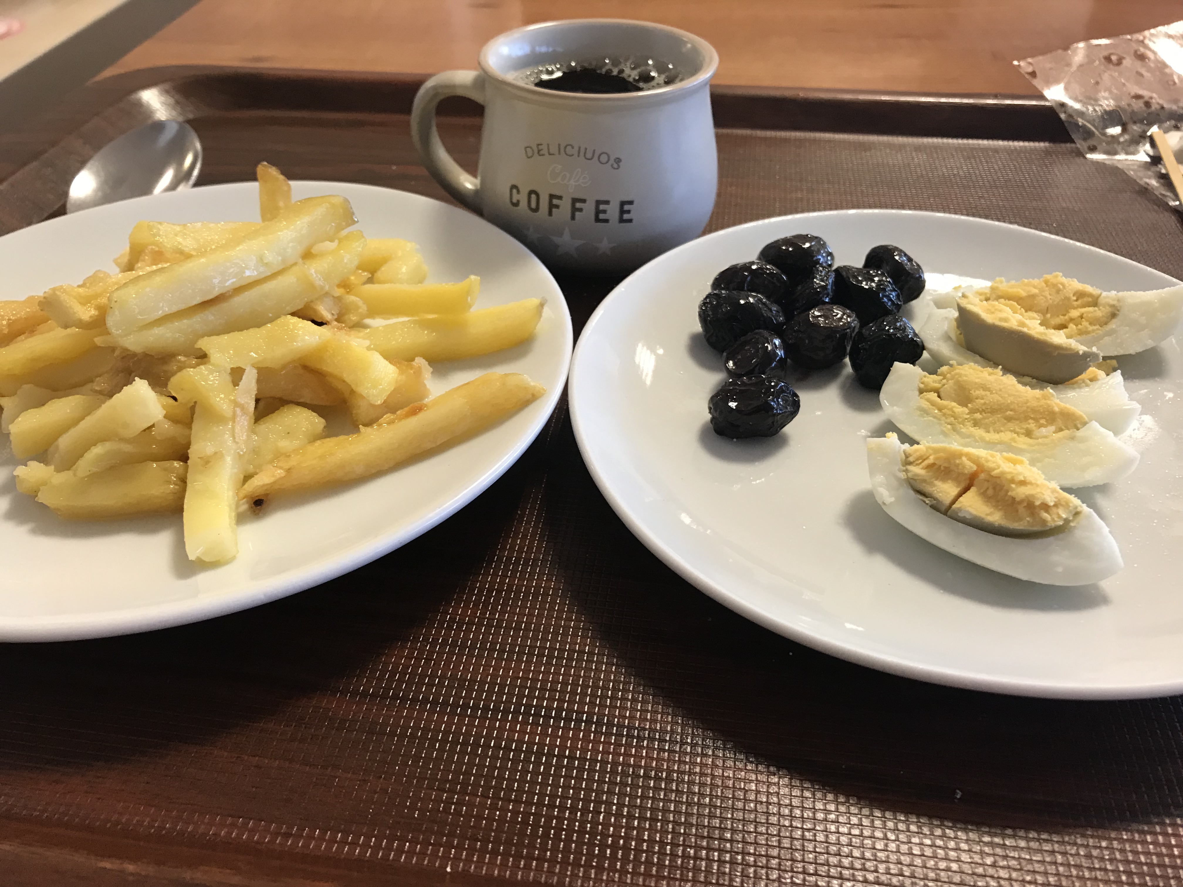 I finished the breakfast with french fries, eggs, olives and tea.