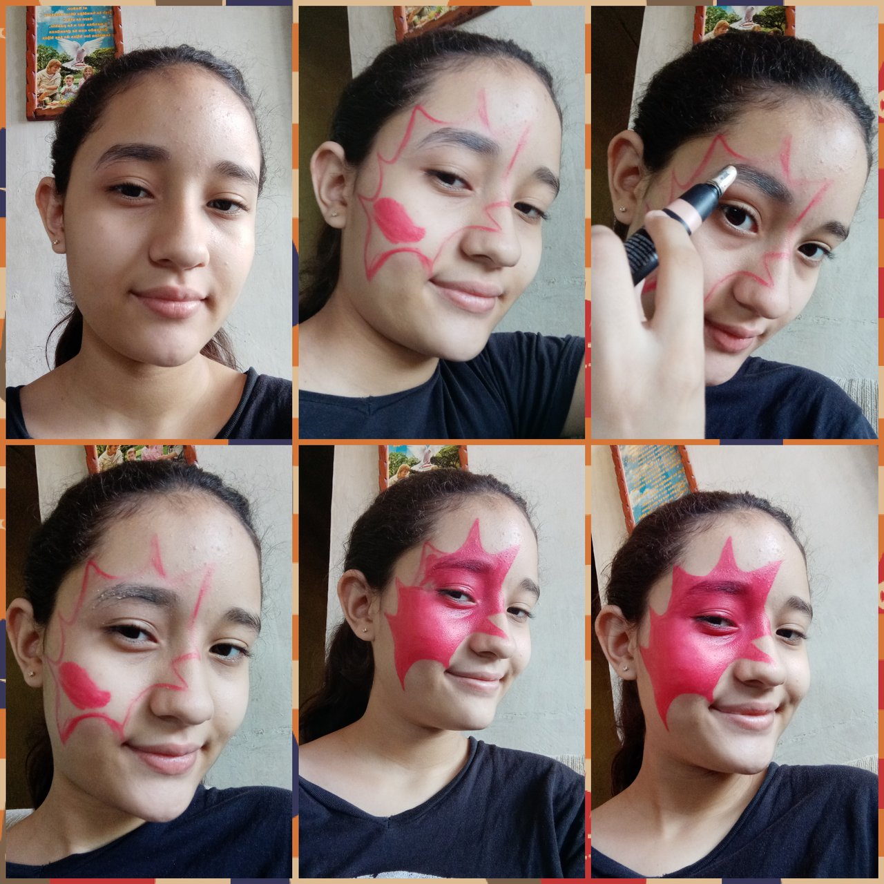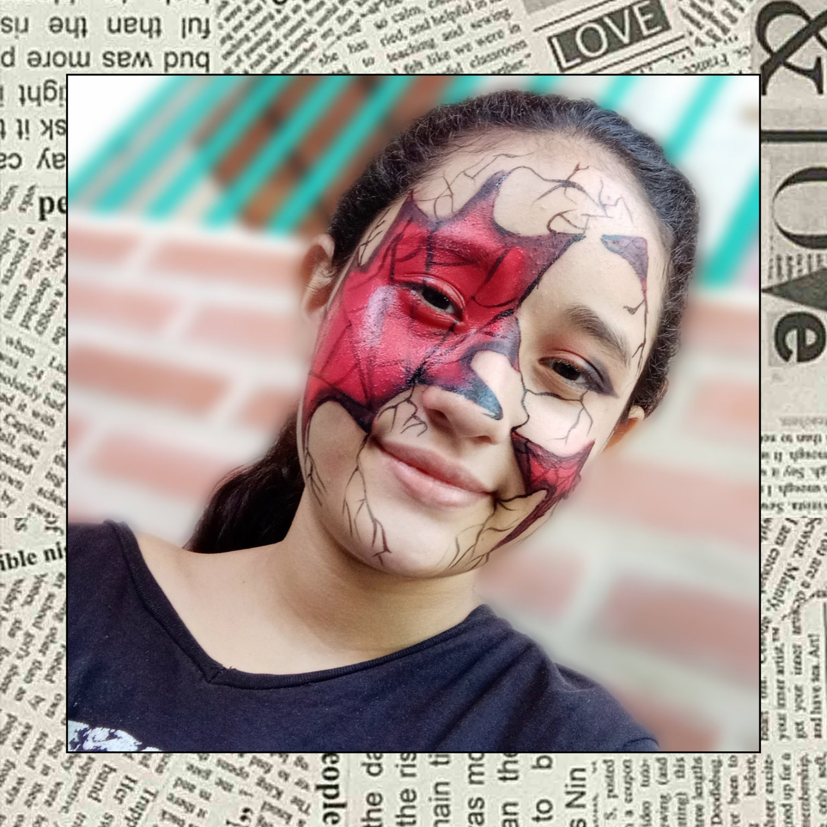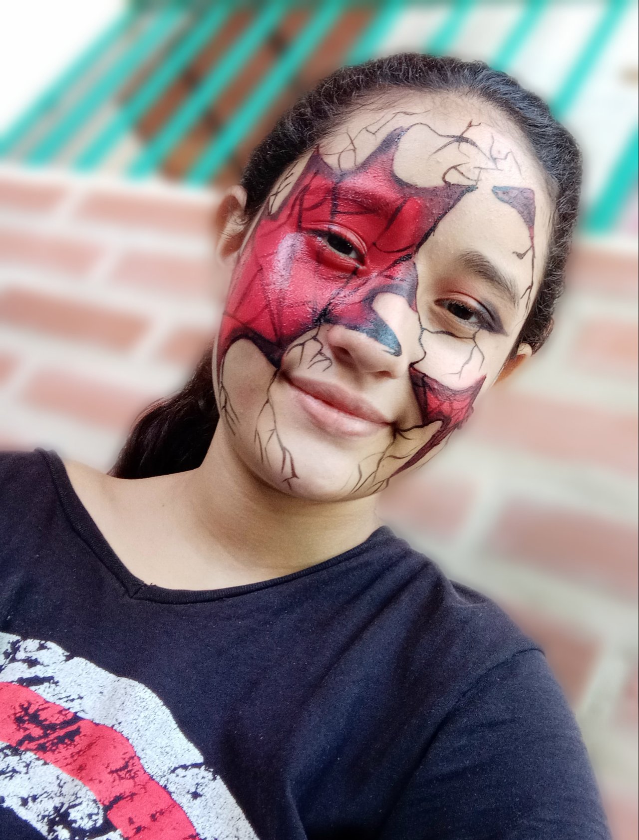 The first thing I did was on my left eyebrow, I made it stick, then with concealer I blurred and hid my eyebrow a little, then with a brush and red lipstick I made the shape of a web from above my eyebrow to beyond my lips, then with red lipstick I started to fill the whole web.