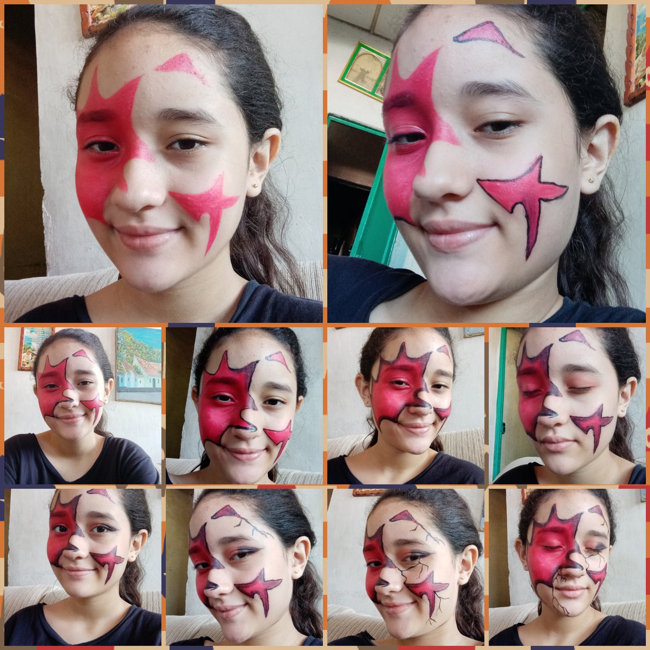 Una vez que termine con las grietas en la cara, me hize la telaraña que va dadentro de la telaraña roja, y por ultimo difumine un poco con sombra negra.