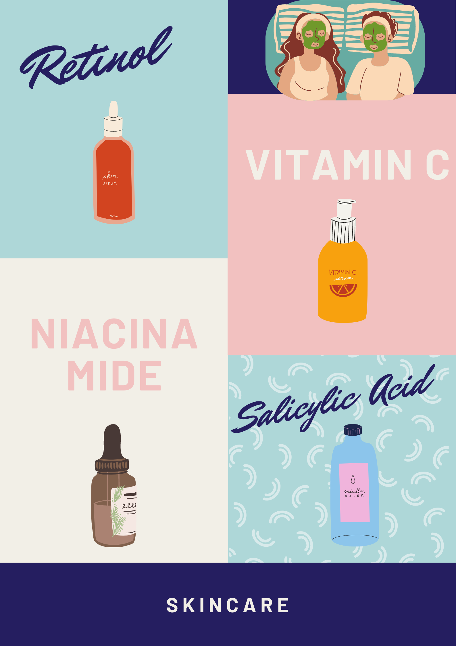 If you are on social networks you have surely heard of these wonders: Retinol (Vitamin A), Niacinamide (Nicotinamide, Vitamin B3), Hyaluronic Acid, Vitamin C, Salicylic Acid. They are active ingredients that we can find mainly in Serums, but also in other products, they are extremely good for our skin but we must know when to use them because some of them cannot be mixed, as I specify in the image.