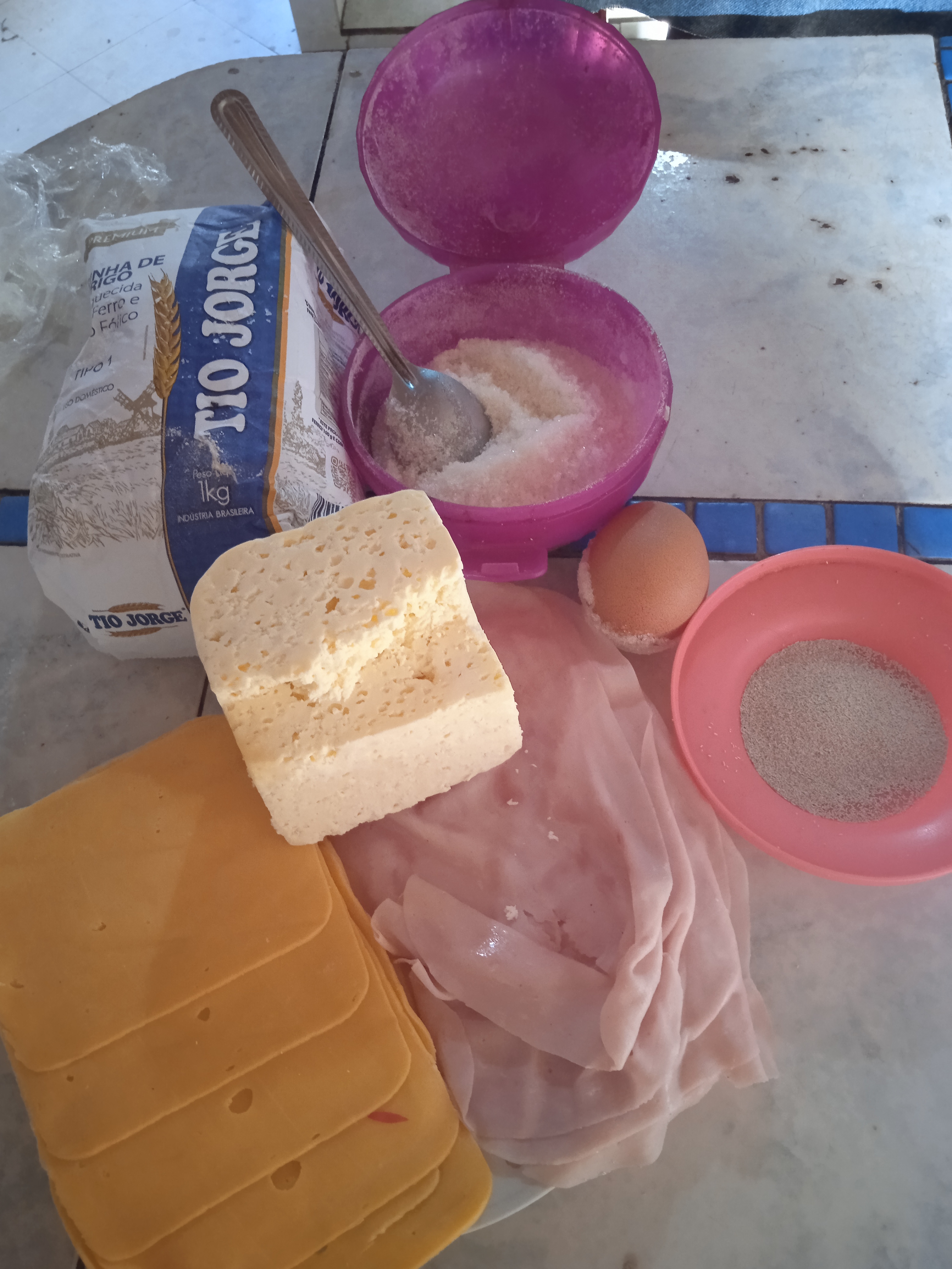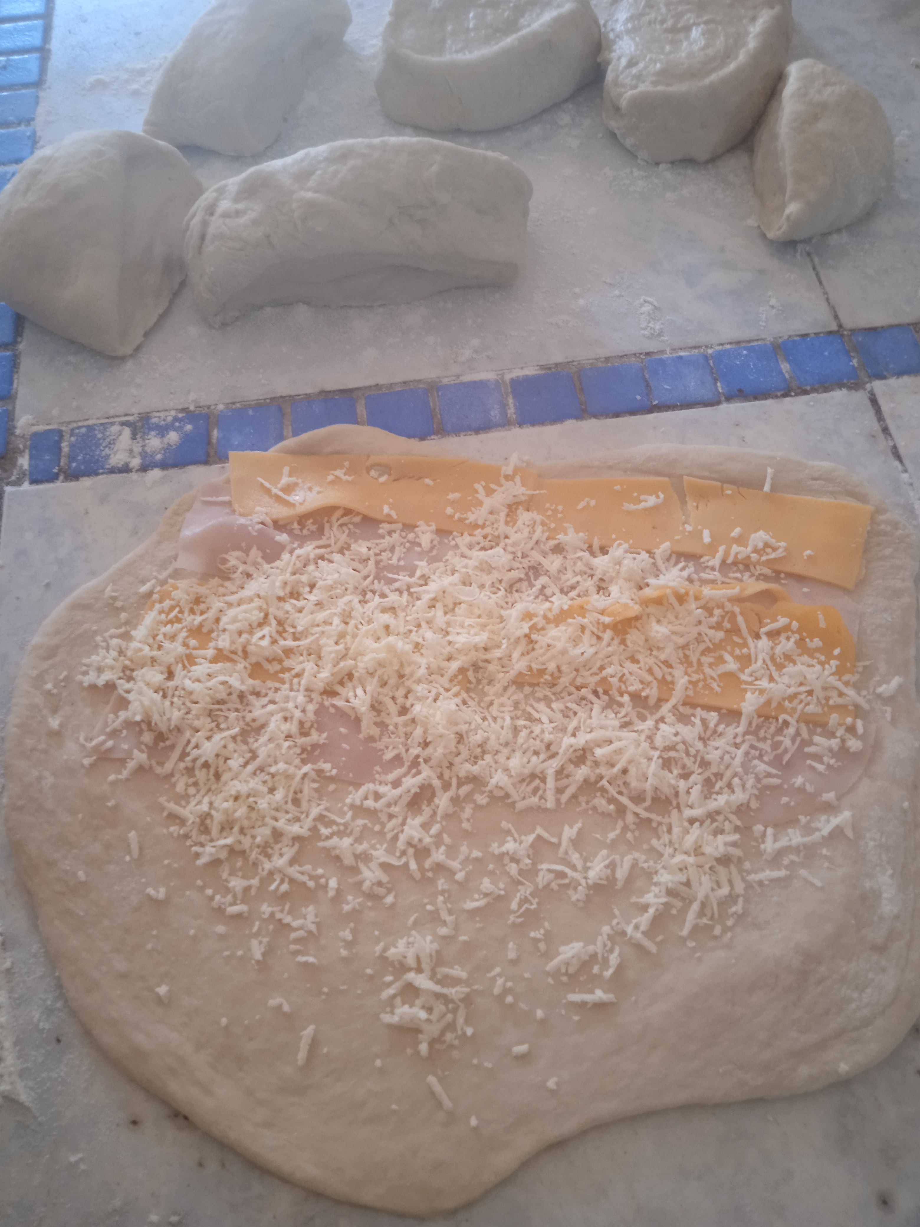 Foto de la masa con el queso y el jamón.