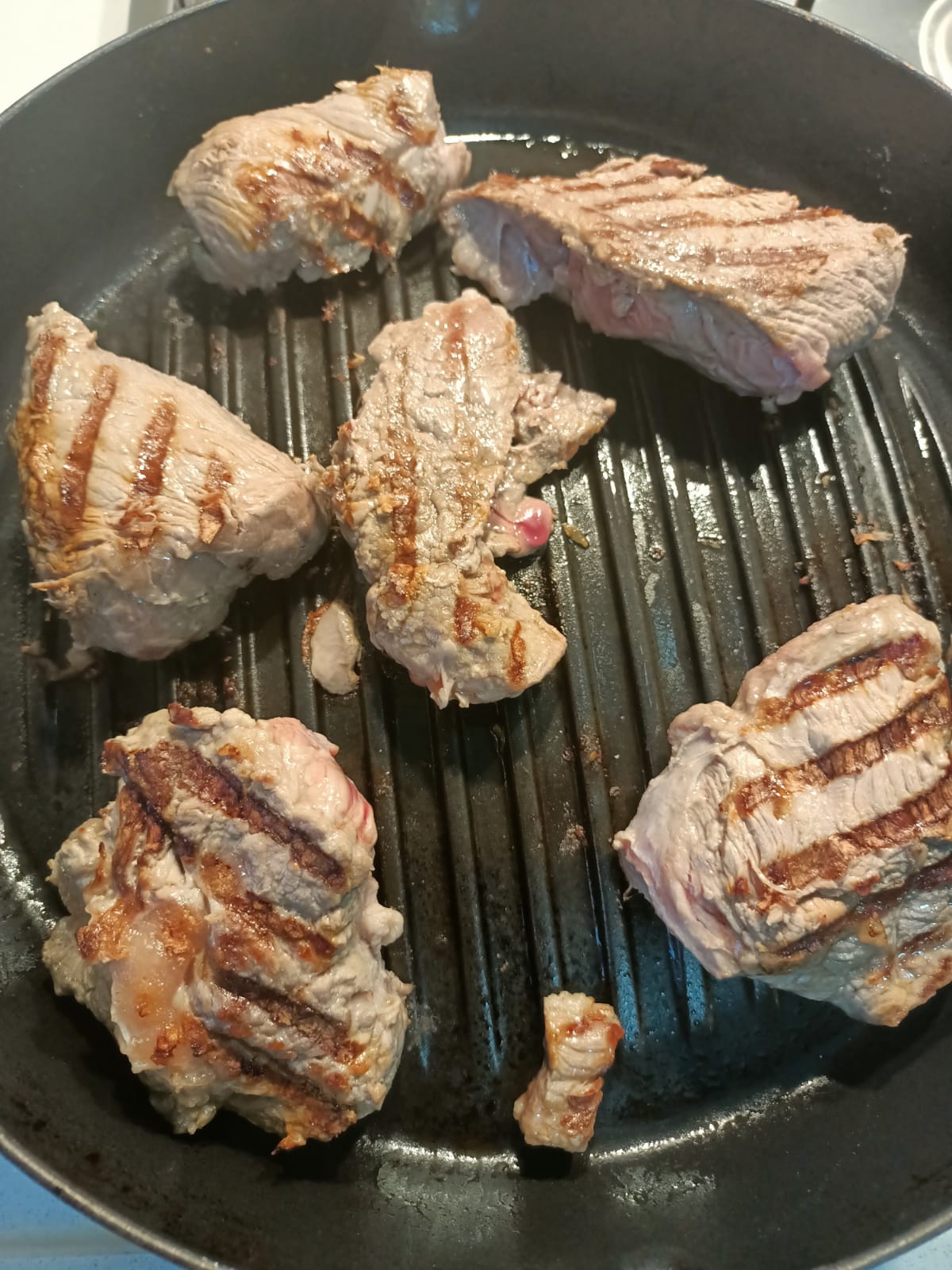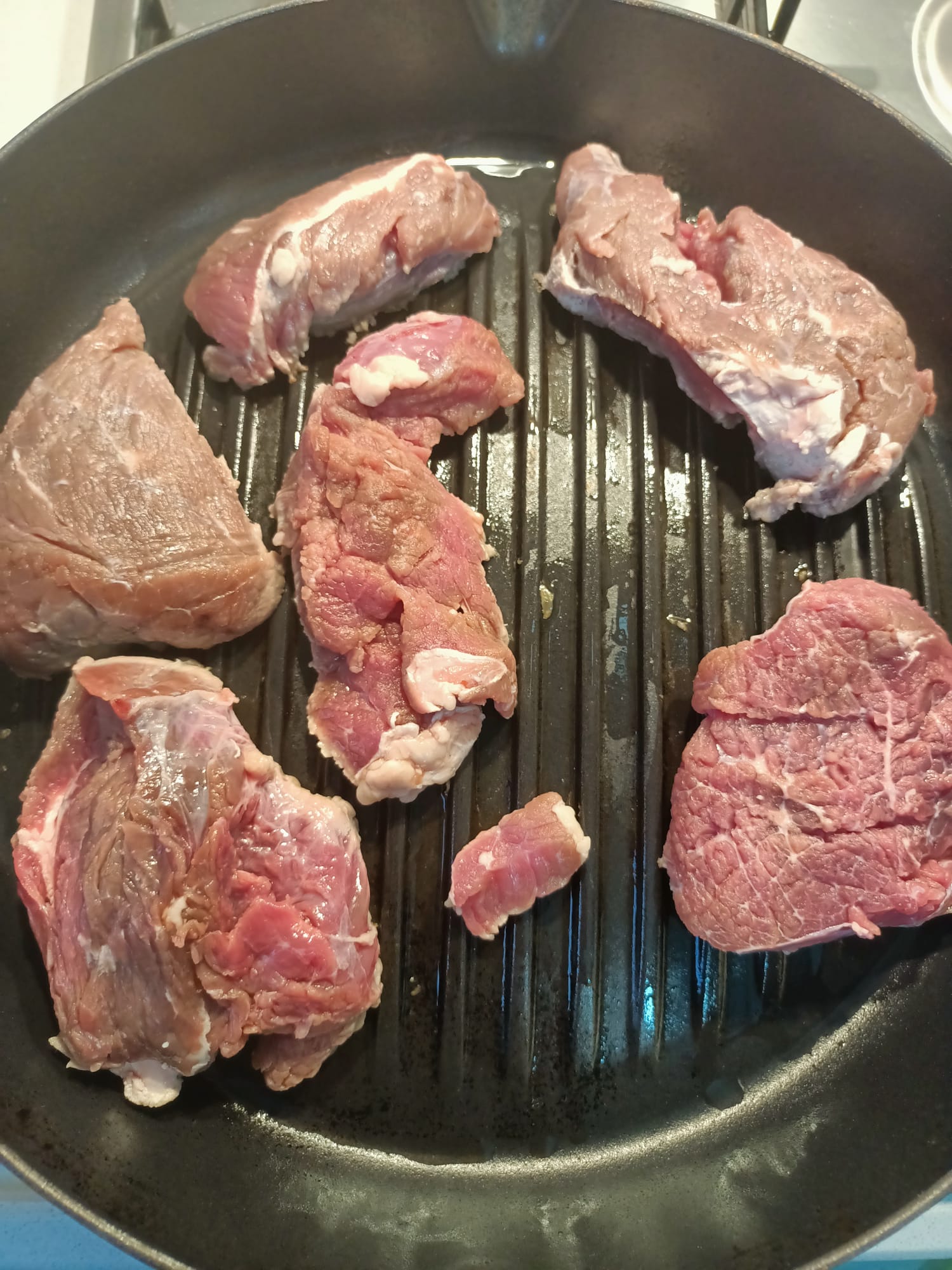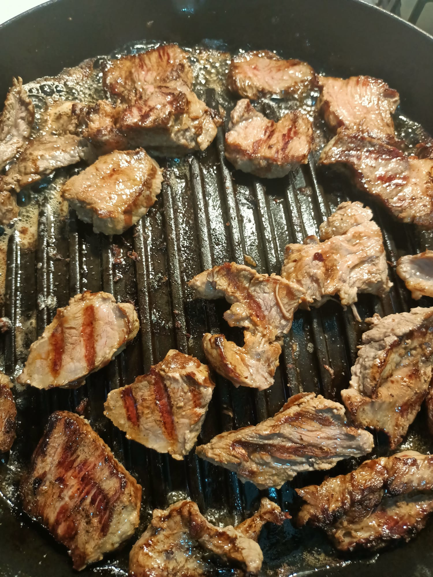 İlk olarak döküm tavayı ocağa koydum ve yeterince ısındıktan sonra etlerimi mühürlemek için tavaya koydum. Güzelce etin dört bir yanını mühürledim.