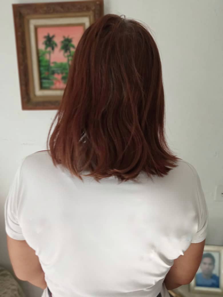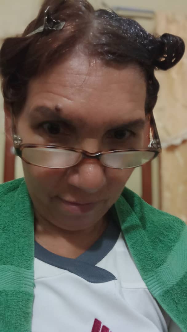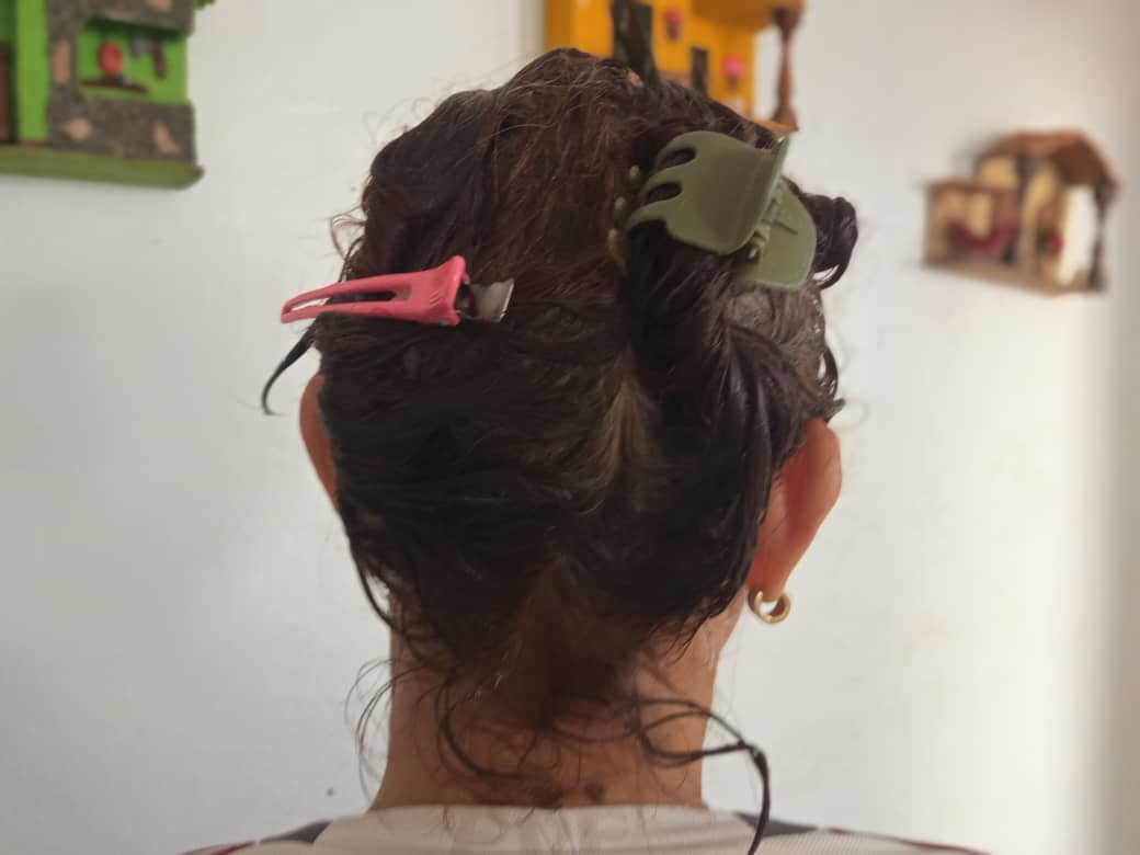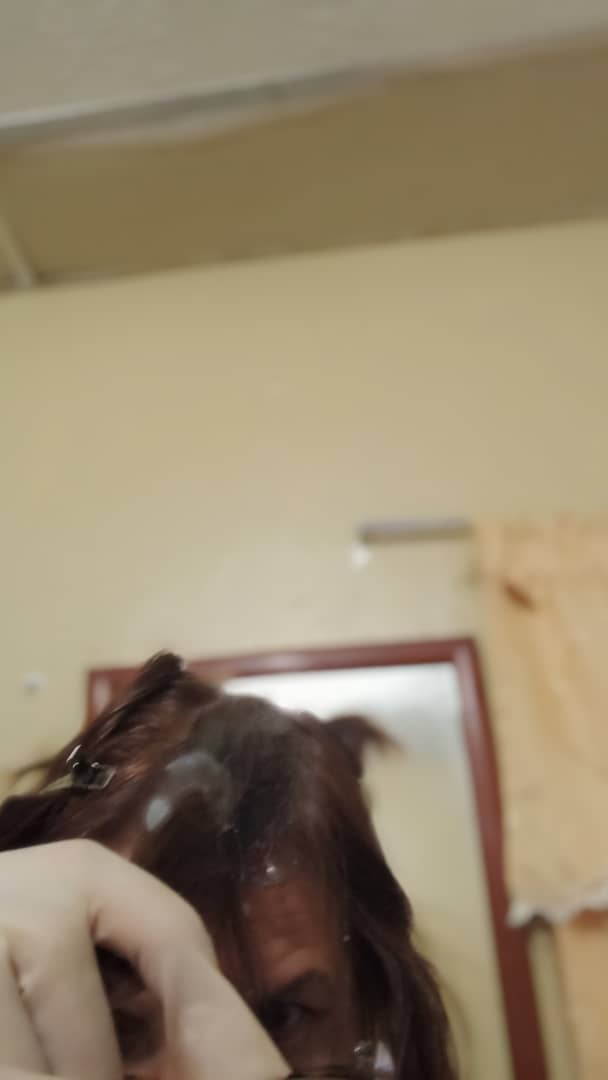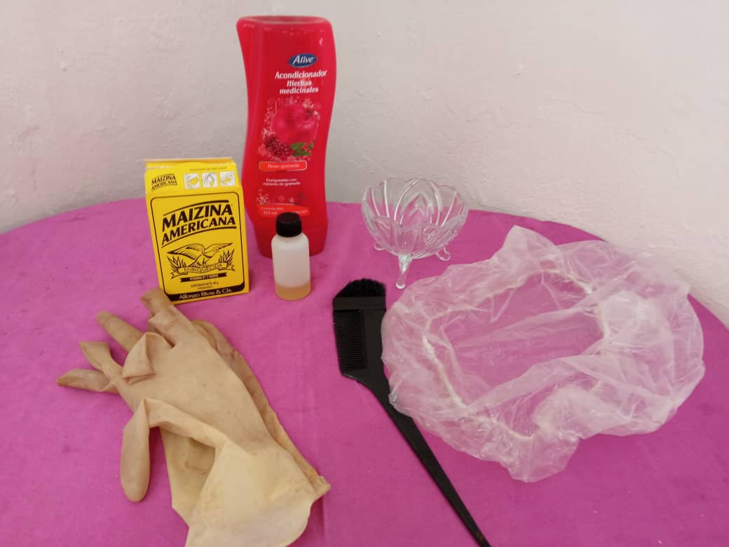 • Ya lista La mascarilla, procedemos a aplicarla en el cabello, Debemos aplicarla de manera uniforme, primeramente comparto el pelo en cuatro partes, uso guantes y una brocha de pintar cabello y voy aplicando capa por capas.