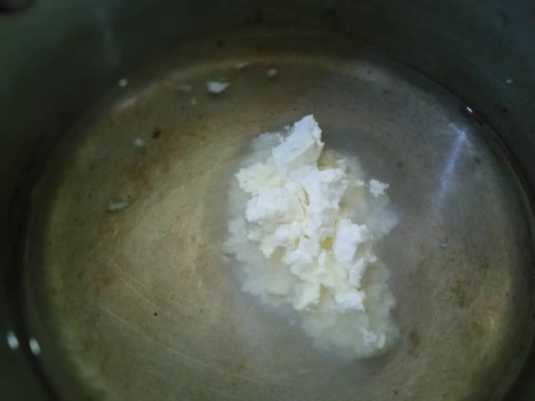 • Once the mixture is ready, transfer it to a container and let it cool, then add the coconut oil and the two tablespoons of conditioner and integrate with a spoon. The conditioner helps to make the mask even more nourishing.