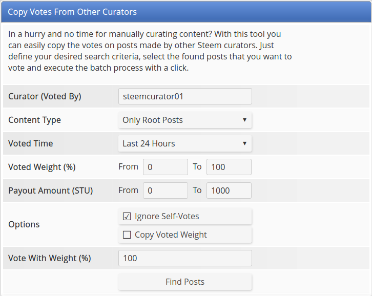 I always wanted to have a tool that gives me a nice possibility to copy other curators votes in times when I'm too busy with other stuff for manually curating peoples posts. So, here it is: