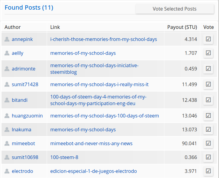 By clicking on Find Posts the tool begins to search for executed votes by the defined curator and filter the found posts based on the given search criteria. A table with the returned posts will be displayed: