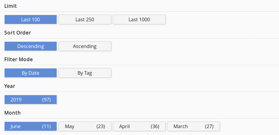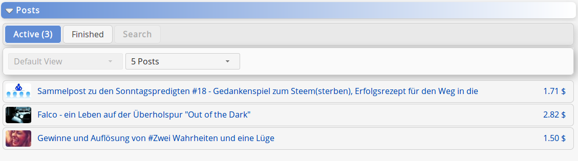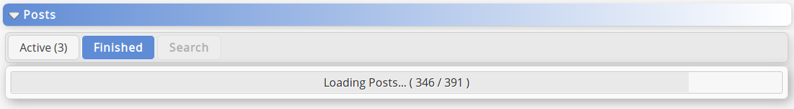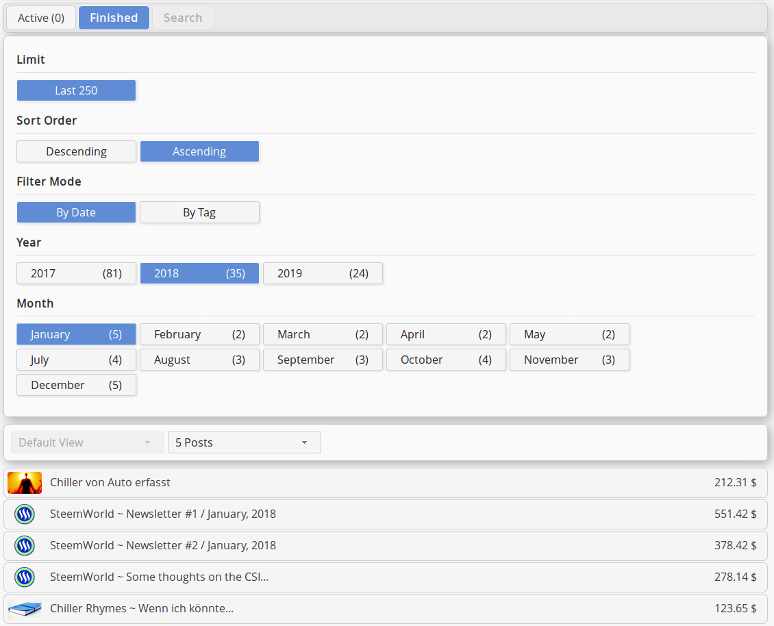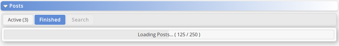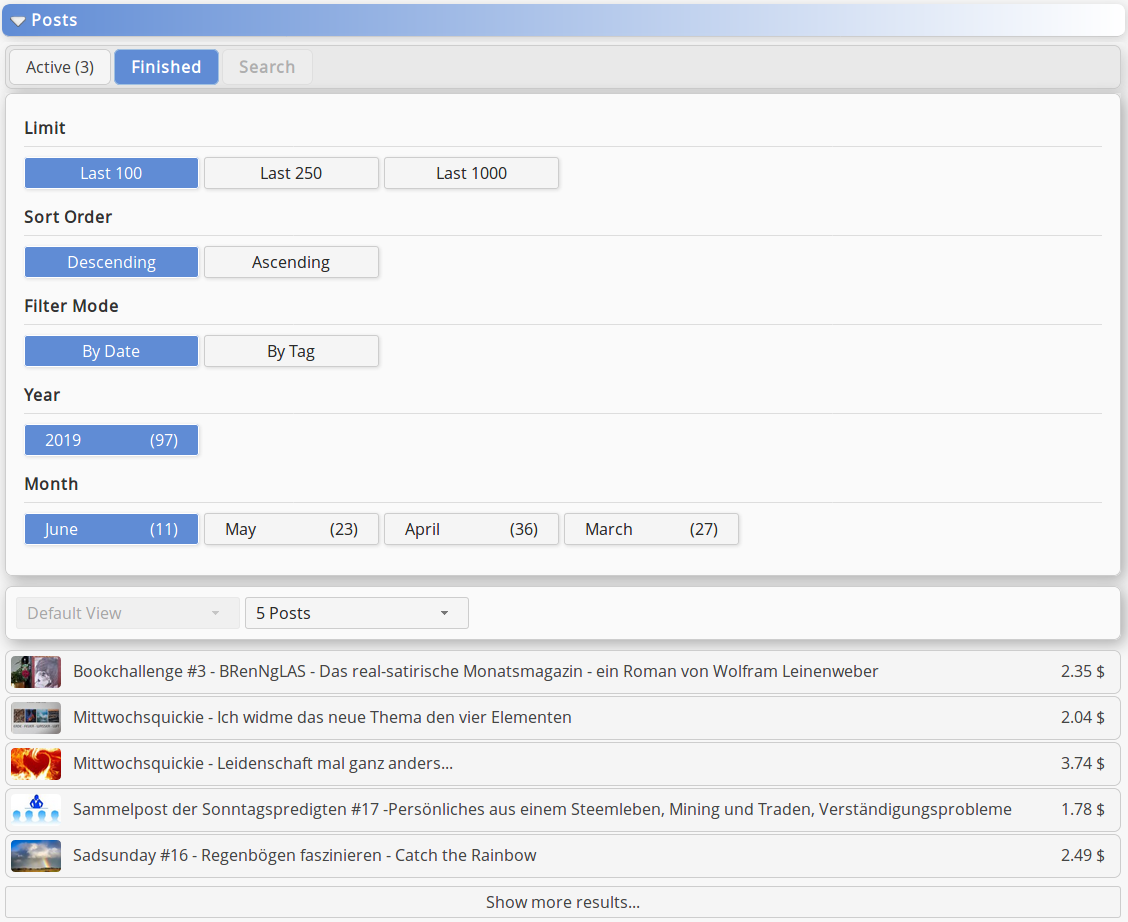 The tab Finished now contains different filter and sorting capabilities. When switching to this tab for the first time, the limit will be set to Last 100 and the last 100 posts will be loaded: