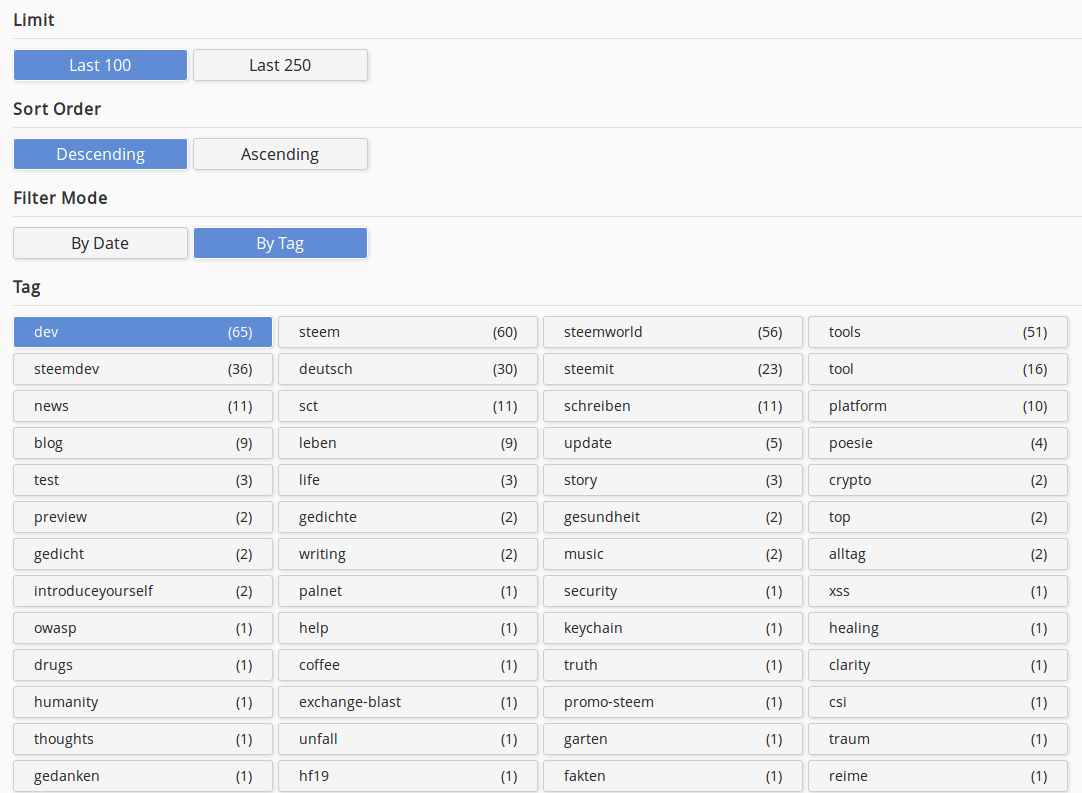 I'm still working on the new overview and I must say that the result begins to satisfy me. The new bar above the posts where we can choose the number of visible posts and later switch between different view styles (list, miniature view and maybe more) will be worked on next.