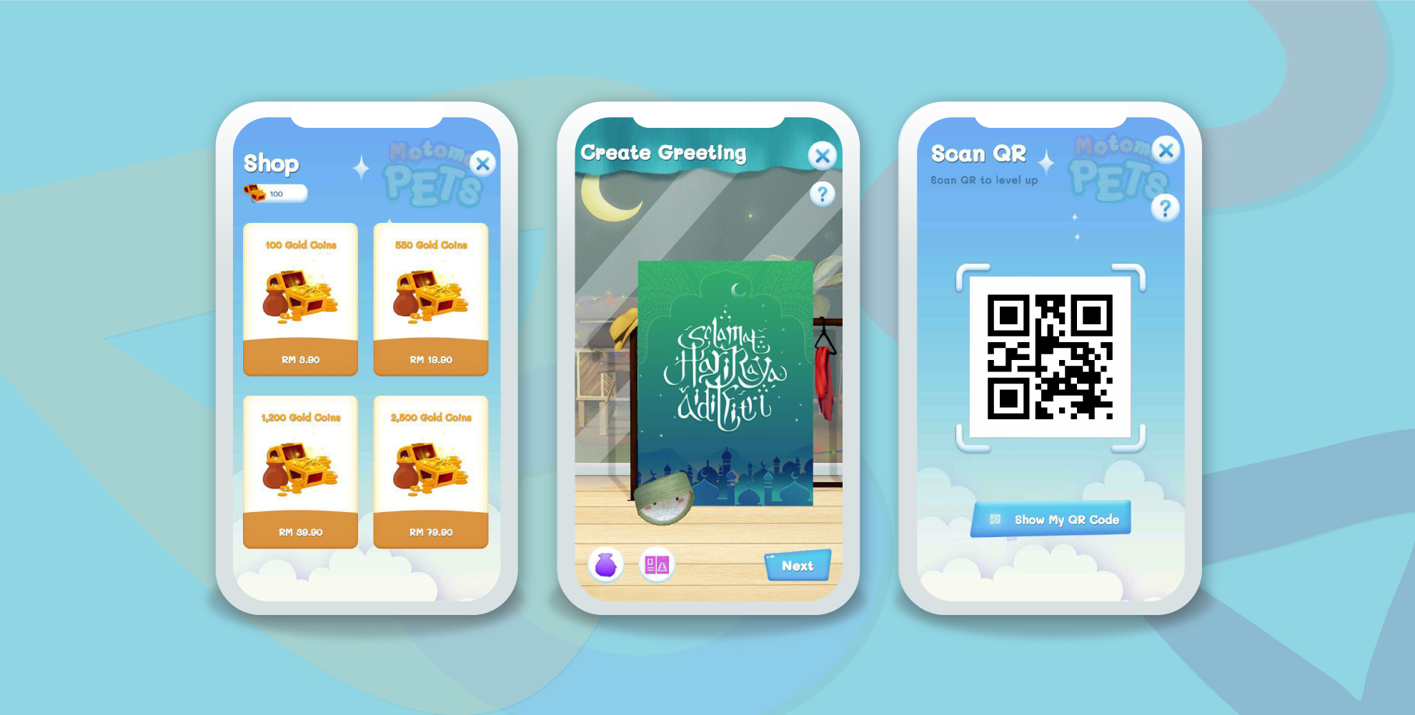 MotomoPets allows users to raise a MotomoPet every festive season. Players interact by scanning and sharing QR Codes between each other. Each time a user scans a QR code of another user, his/her pet earns some blessings and in turn, grows a little. As the pet grows, it will eventually evolve to a higher phase, allowing it to access more features like wearing accessories.