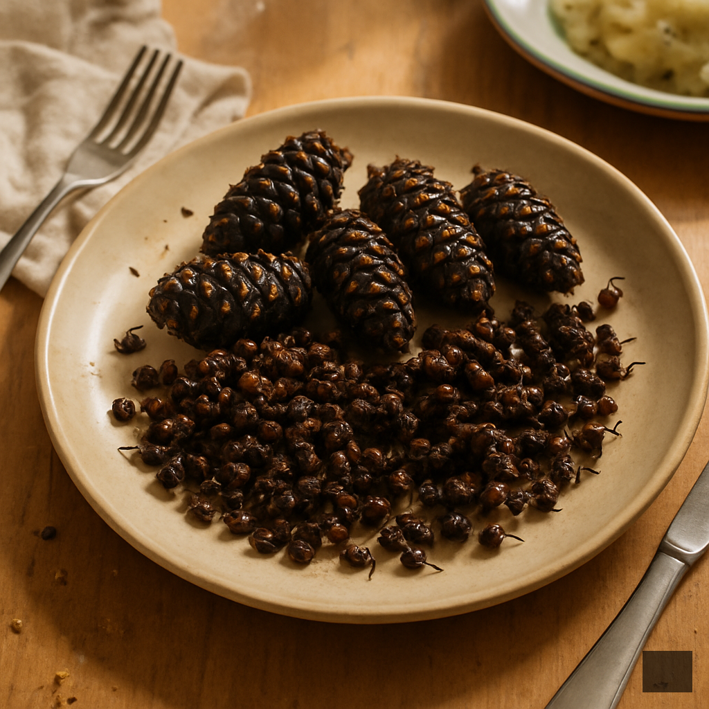 Ein außergewöhnliches und experimentelles Gericht aus der Insektenküche. Die gegrillten Ameisen bieten einen nussigen Geschmack, während die Tannenzapfen eine harzige, waldige Note beisteuern. Ein wahres Abenteuer für mutige Gaumen!