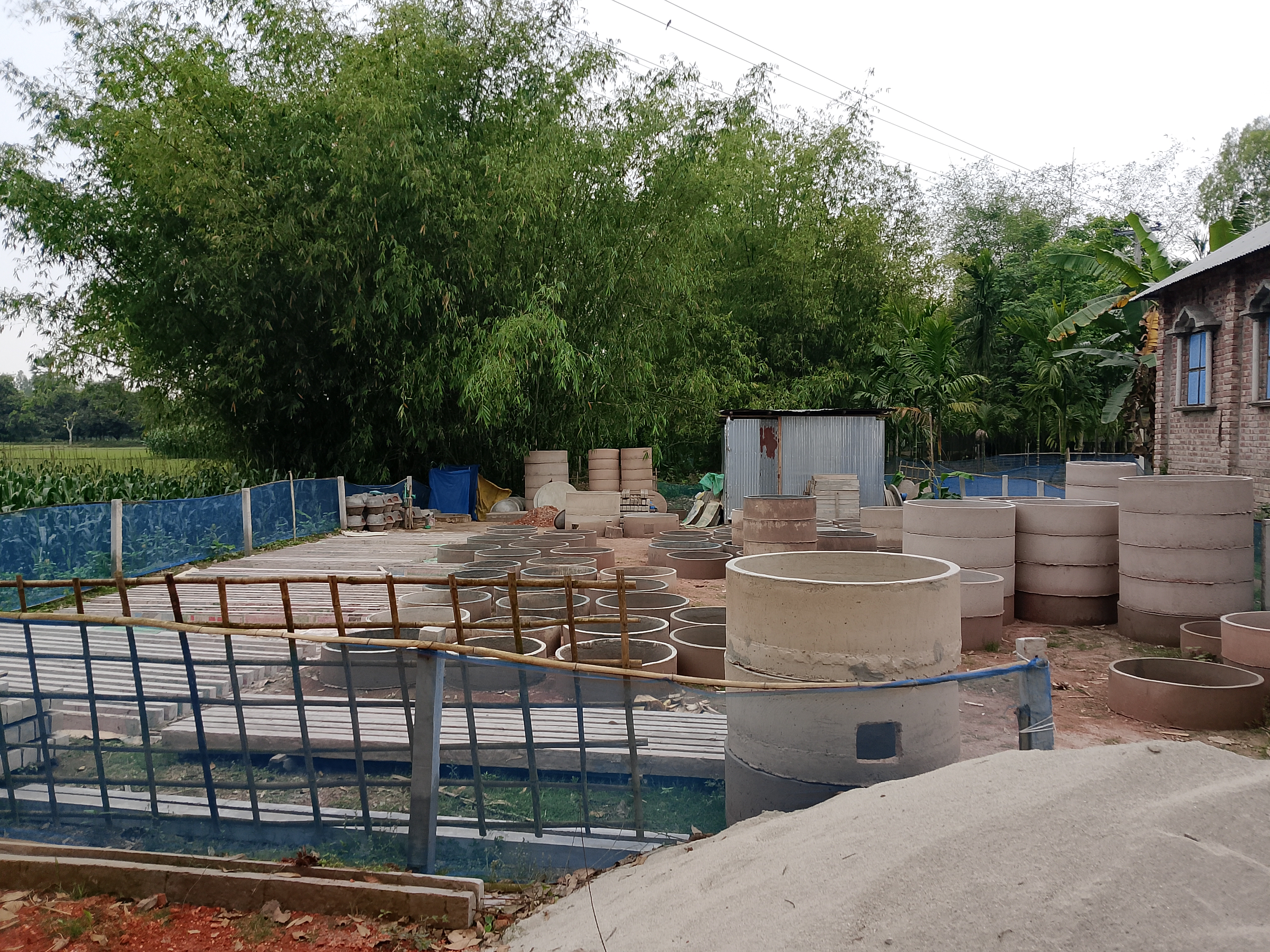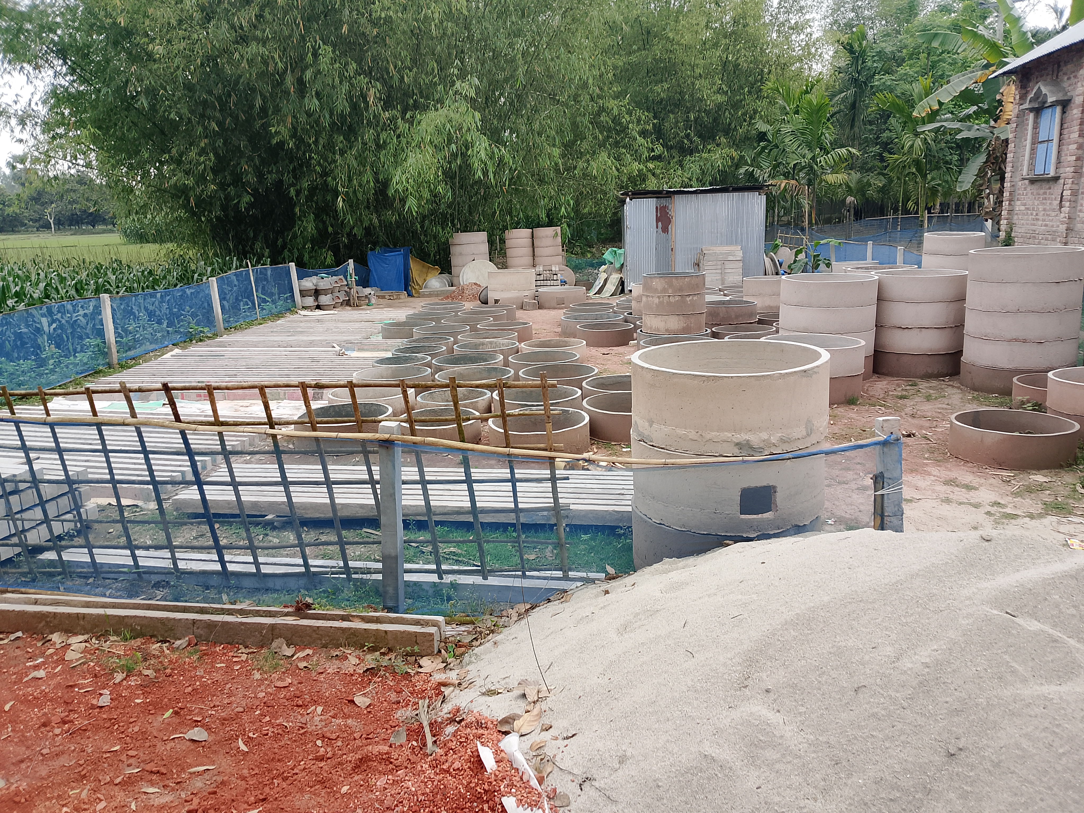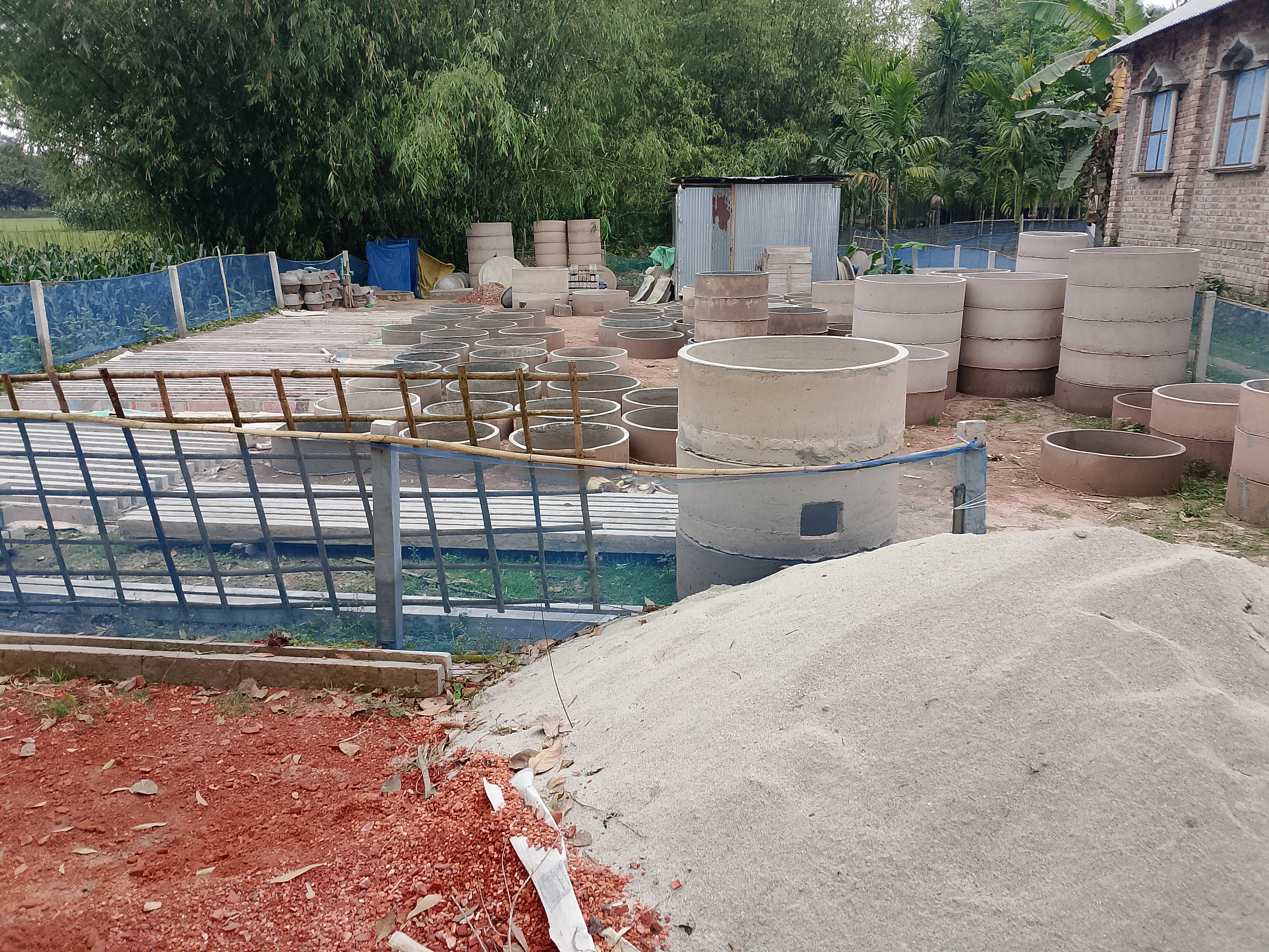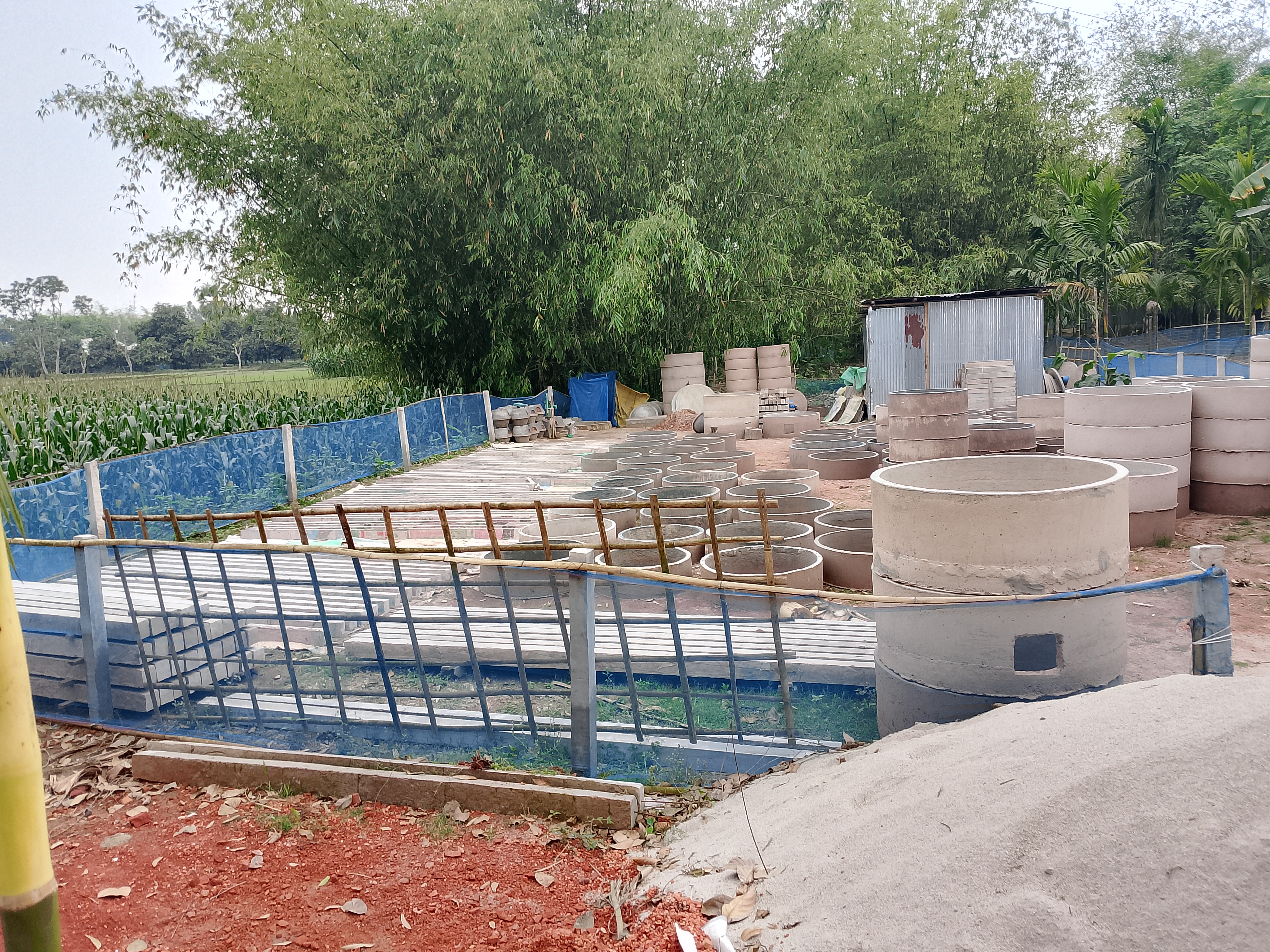 This is a factory where various items are made from cement. Everything is produced here, starting from rings to other items. This cement factory produces very good products. The area has been properly enclosed, and the items are made here.