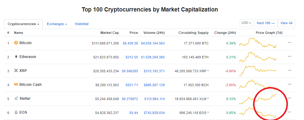 지난 4월 시가총액 5위에 진입한 이후 7개월간 자리를 지키던 이오스(EOS)가, 10일(현지시간) 스텔라(스텔라루멘, XLM)에게 시총 5위의 자리를 내줬다. 8월 즈음부터 스텔라와 이오스의 시총이 비등비등해지면서 스텔라가 시총5위에 진입할 것이라는 예측은 간간이 나왔던 상황이다.