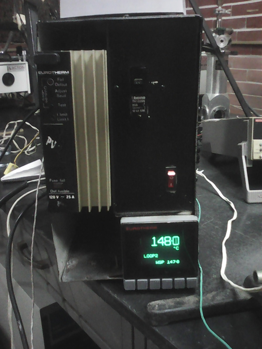 El siguiente paso es conectar el horno vertical de síntesis a un controlador de temperatura programable (figura 2), cuya función en especifico es regular la temperatura requerida por nosotros, y a su vez esta conectado a una fuente regulable o fuente de voltaje (figura 3), este aparato registra los puntos máximos y mínimos de temperatura establecidos en el programa de síntesis previamente, el software fue diseñado por los técnicos de (LEMIN). El horno puede soportar una temperatura aproximada de 1500 ºC, para medir la temperatura se usó un termopar cromel / cromel-alumel.