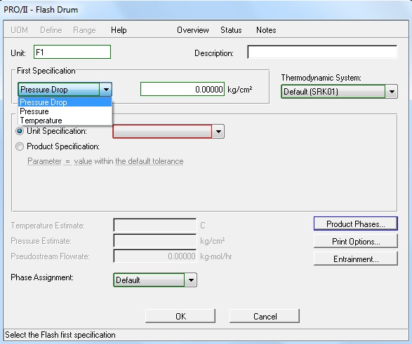 Al activar esta opción aparecerá una ventana en la cual se debe ingresar las especificaciones de operación de la unidad flash. Para esta unidad se debe dar dos especificaciones de operación, una debe ser temperatura o presión. La segunda especificación define si el flash es isotérmico, isentrópico, si ocurre en el punto de burbuja o de roció, o si hay requerimientos de suministro de calor.