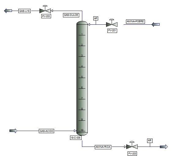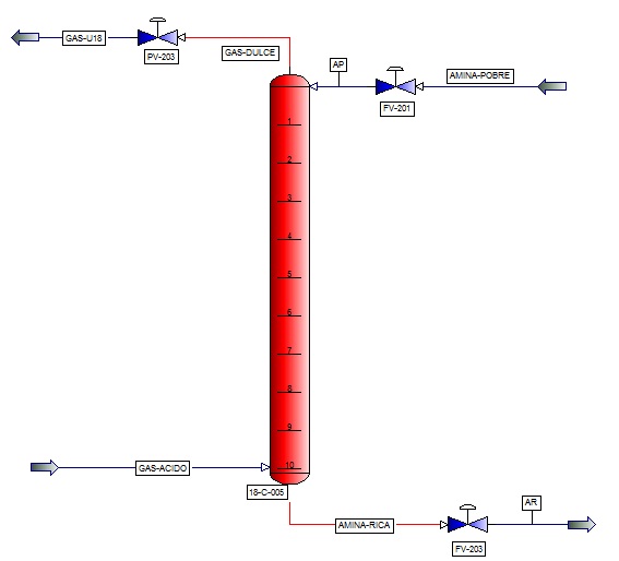 Por ejemplo, se montó el diagrama de flujo de procesos de una columna de absorción con amina para el proceso de endulzamiento del gas. Los equipos se verán en color gris antes de correr la simulación (imagen 1), si la convergencia es exitosa se verá azul (imagen 2), si la convergencia es errónea se verá rojo (imagen 3)
