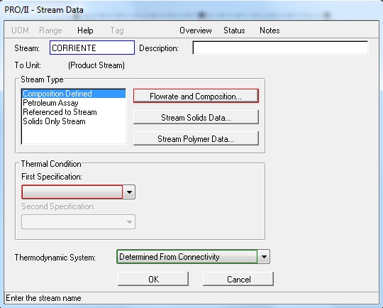 Primero debe crear una corriente, se dirige a la paleta PFD y haga clic en Stream, luego proceda a dibujar la corriente en el editor de PRO/II. Para definir la corriente se debe ubicar el punto del mouse sobre la línea que representa la corriente y hacer doble clic, aparecerá una ventana en la cual deberá llenar los campos que están bordeados de color rojo. Las especificaciones normalmente son temperatura, presión y flujos o composiciones.