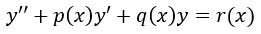 Donde p(x), q(x) y r(x) son funciones solo de x, el término segundo orden hace referencia al hecho de que la derivada de mayor orden que aparece en la ecuación es una segunda derivada, existe una amplia teoría que estudia estas ecuaciones, sin embargo, el caso más elemental ocurre cuando r(x) es igual a cero y los coeficientes p(x) y q(x) toman valores constantes, es decir, una ecuación diferencial de la forma