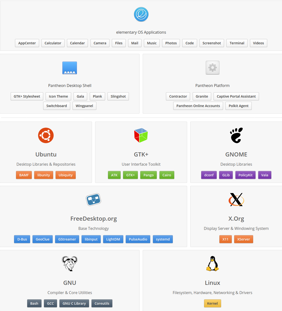 This is common even in entire operating systems where the creators will build a new distinctive distro using the millions of lines of code of an existing system. For instance, ElementaryOS is built out of Ubuntu which was originally built out of Debian. But at the very base of nearly all distros we'll find two common systems, The FreeDesktop.org Linux base, and X.org window and display server. Elementary.io, the ElementaryOS website, includes this excellent info-graphic diagram that pays respect to the project Elementary was built on: