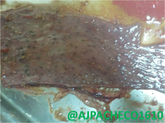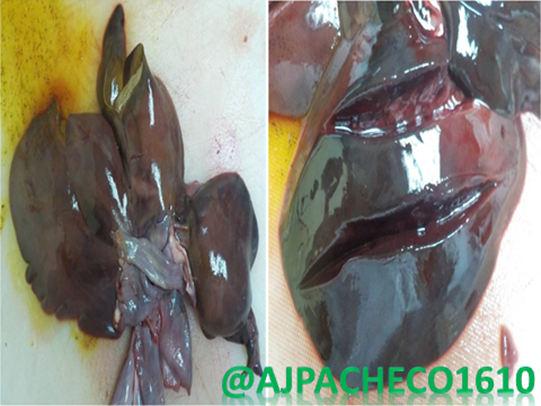 Por su parte, el hígado se observó aumentado de tamaño, tumefacto, congestivo, con consistencia friable, bordes redondeados, de color vinotinto oscuro y un exudado sanguinolento al corte, hallazgos estos que se corresponden con congestión pasiva crónica (Figura 16).