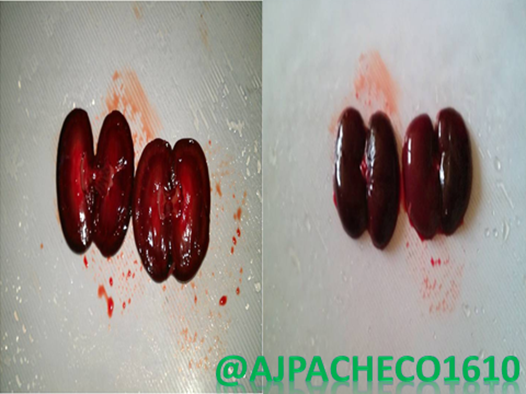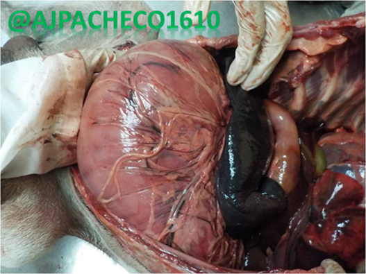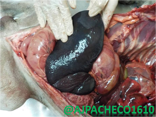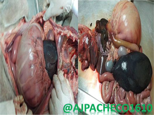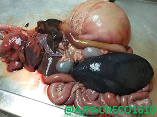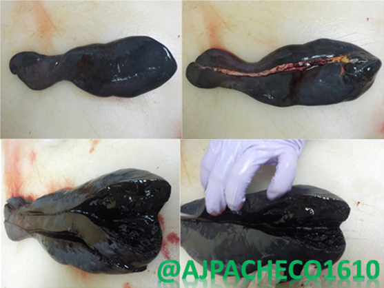 A nivel de sistema linfohematopoyético, el bazo se observó tumefacto, severamente congestivo, con consistencia friable, bordes redondeados, de color vinotinto negruzco, con un importante aumento de tamaño y un exudado sanguinolento al corte (Figura 9). Asimismo, como se comentó anteriormente, dicho órgano había realizado un giro sobre su propio eje, esto debido a su ubicación anatómica, al estar íntimamente relacionado con el estómago (Figura 10).