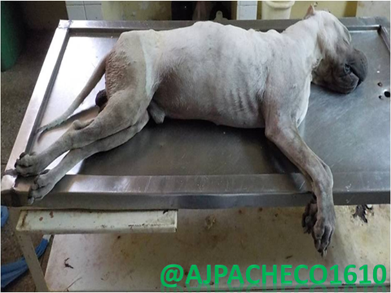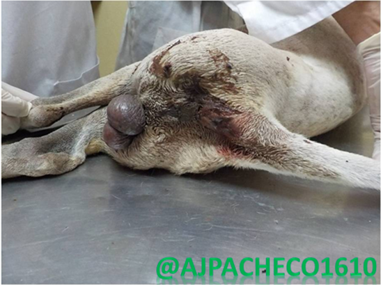 Durante la realización de la inspección externa, solo se observó la presencia de heces pastosas adheridas alrededor del ano (Figura 2), lo cual es indicativo de que además el animal presentaba diarrea.