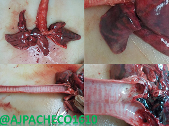 A nivel de sistema respiratorio, los pulmones se observaron reducidos de tamaño (colapsados), de color rojo-negruzco, con consistencia firme y un exudado sero-sanguinolento al corte, el cual se extendía desde los bronquios menores hasta la tráquea, hallazgos estos que se corresponden con la fase de hepatización roja presente en los procesos neumónicos (Figura 7).