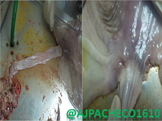A nivel de sistema digestivo, el estómago se evidenció con una gran dilatación, asimismo dicho órgano había realizado un giro sobre su propio eje a nivel del cardias, evidenciándose en dicha área una zona de color rojo violáceo producto de la falta de irrigación ocasionado por dicha torsión. Entretanto, a nivel de su mucosa había pérdida de los pliegues gástricos (Figura 12), y su serosa se mostró además hiperémica (Figura 13). De igual manera, en el interior del mismo se encontró la presencia de una gran cantidad de contenido alimenticio y gas (Figura 14).