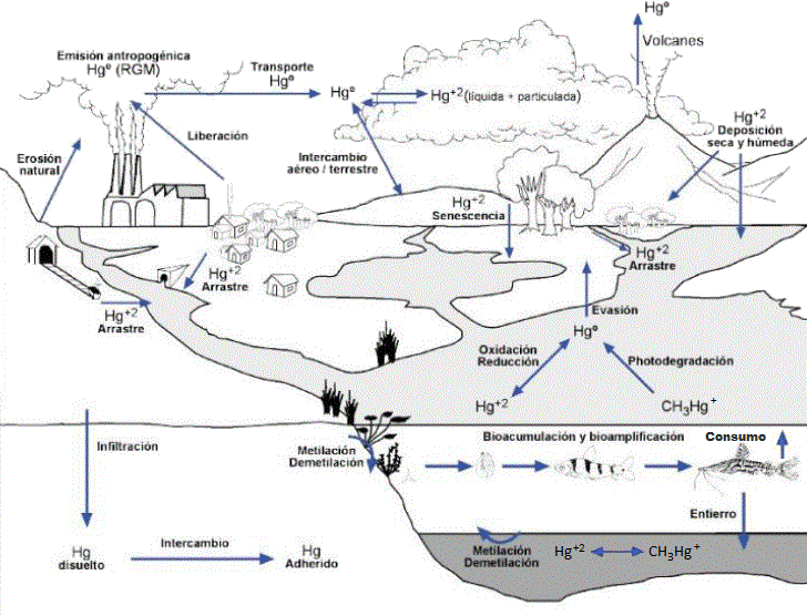 En general estas fuentes liberan mercurio elemental (Hg0) al medio ambiente el cual posteriormente es oxidado tanto en la atmósfera como en el agua a su estado de oxidación más común el cual es (Hg2+). Una vez que el mercurio (Hg2+) proveniente del mercurio elemental o del inorgánico (ej: HgCl2 y HgS) sedimenta en un medio acuático es entonces metabolizado por microorganismo a metilmercurio, este ciclo puede ser apreciado en la figura 2. El metilmercurio es un catión organometálico de fórmula química [CH3Hg] + y es considerado una de la forma orgánica del mercurio más tóxica a la que todos estamos expuestos. El metilmercurio se bio-acumula y bio-amplifica, lo que quiere decir que sus efectos tóxicos incrementan a medida que se sube en la cadena alimenticia, por ejemplo, lo peces que se alimentan del sedimento acuático poseen bajas cantidades de metilmercurio en su organismo, pero sus depredadores que ingieren varios peces de éstos a diario tendera a incrementar la concentración de metilmercurio en sus organismos y así hasta llegar al tope de la cadena alimenticia siendo los peces espada y atunes los animales marinos consumidos por el ser humano con mayor concentración de metilmercurio.2,3