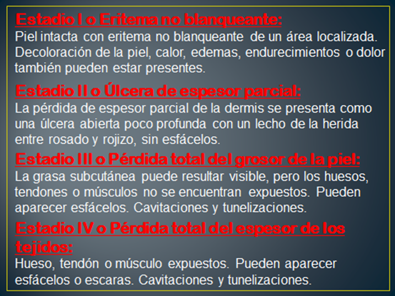 Una vez descritos y conocidos los estadios podemos decir, que la úlcera por presión que presenta el paciente este estadio III ya que existe pérdida del grosor de la piel, necrosis del tejido, ubicada en la región sacra.
