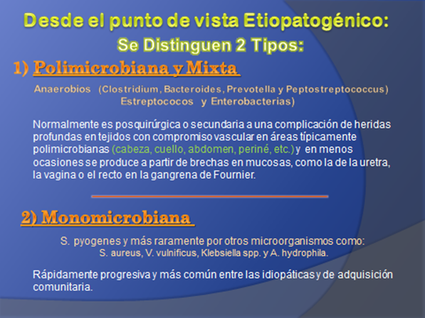 Generalmente la etiología involucra microorganismo presente de la flora bacteriana normal de la piel, así mismo aquellos agentes presentes en el medio ambiente, que logran invadir a los tejidos subyacentes a partir de soluciones de continuidad, la gravedad de la patología viene dada dependiendo de las característica del microorganismo en cuanto a su virulencia, tamaño del inoculo, la sinergia bacteriana y las condiciones del huésped ya que existen factores o condiciones que hacen de la persona un huésped susceptible como aquellos (reducción del flujo arterial, estasis venosa o linfática, fenómenos inflamatorios locales, presencia de cuerpos extraños, edad avanzada, diabetes mellitus).