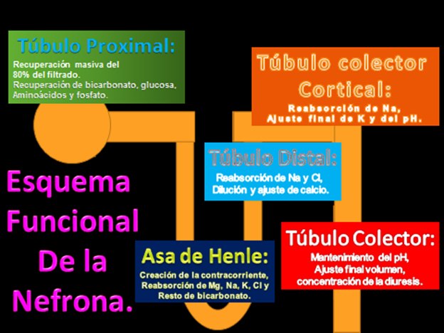 En la siguiente imagen se detalla las diferentes funciones que cumplen cada túbulo dependiendo el segmento, estructura o localización.