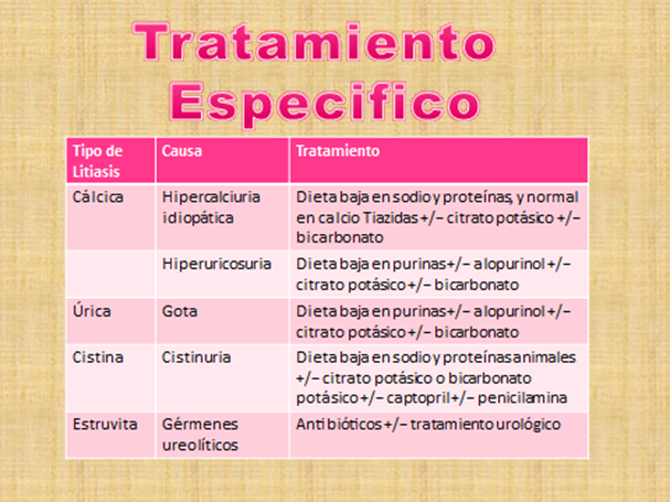 El tratamiento médico tiene como objetivo fundamental evitar o prevenir la formación de nuevos cálculos, asimismo asegurar una correcta hidratación de modo que el volumen urinario oscile entre 2-3 litros por día. Sumado a esto se debe orientar al paciente en cuanto a la ingesta de sodio que generalmente debe de ser de 2 g/día.