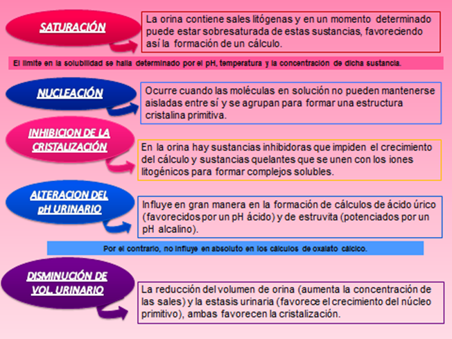 Los cálculos renales se caracteriza por ser estructuras cristalinas, formados por materiales que generalmente se eliminan por la orina, a pesar de la gran controversia estudios señalan que los cálculos renales se originan en el intersticio medular, luego se adhieren a las papilas renales y crecen hasta romperse, cuyos fragmentos se dirigen al sistema excretor. Con mayor frecuencia están constituidos por sales de calcio (70% aproximadamente), seguido de los cálculos de ácido úrico (color rojo anaranjado) y con menor frecuencia los cálculos de cistina (color amarillo).