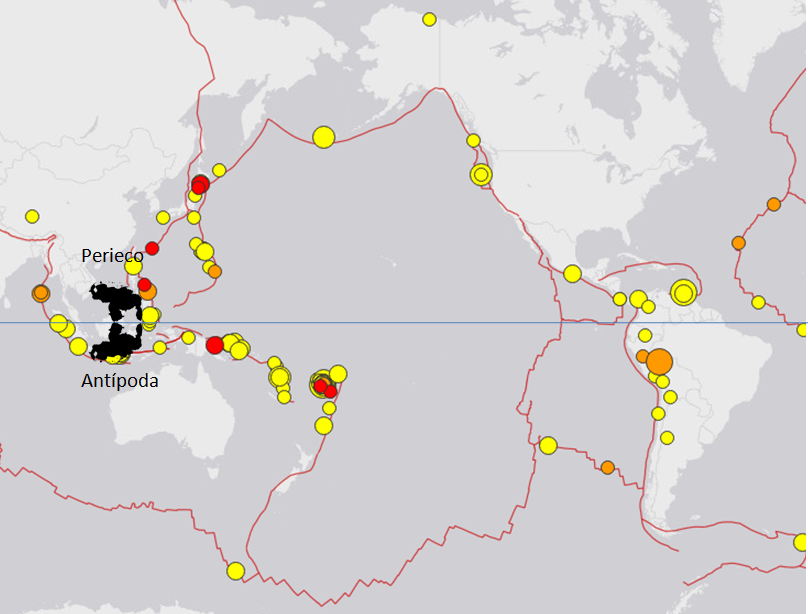 La zona antípoda está ubicada a 180 º de longitud, es decir, una zona diametralmente del lado opuesto. Existen páginas que nos pueden indicar inmediatamente el punto exacto con coordenadas geográficas, además de información adicional del Perieco y Anteco, que no describiré aquí.