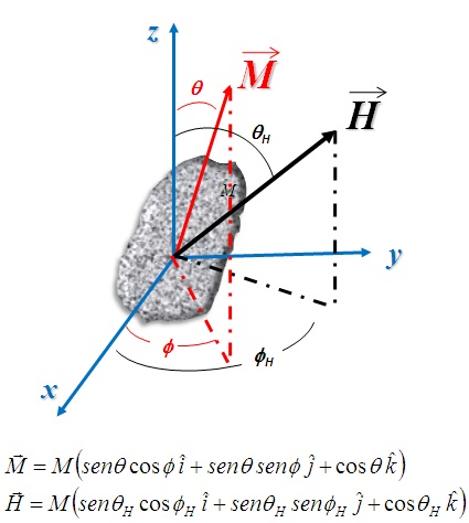 donde (θH, φH) son los ángulos del campo magnético, (θ, φ) los ángulos de la magnetización, μ0 la permeabilidad del vacío, μR=1+χ la permeabilidad del medio y χ›0 la susceptibilidad paramagnética. La magnetización se orienta de tal manera que la energía magnética es mínima en las posiciones de equilibrio θ=θ0 y φ=φ0, es decir se deben satisfacer las condiciones de equilibrio usuales,