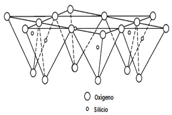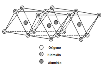 La estructura de las arcillas consiste en dos unidades básicas, una lámina octaédrica y una tetraédrica. La lámina octaédrica está formada por cationes (comúnmente aluminio, hierro y magnesio) que se encuentran coordinados en forma octaédrica con seis átomos de oxígeno o hidroxilos (Figura 1). La segunda unidad estructural es la capa de silicato, en la cual cada átomo de silicio está rodeado por átomos de oxígeno los cuales forman un tetraedro (Figura 2)