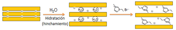 La síntesis de las arcillas modificadas se llevó a cabo mediante una reacción de intercambio iónico, en la cual cationes inorgánicos presentes en la arcilla son cambiados por órgano-cationes voluminosos provenientes de líquidos iónicos, como se describe en el esquema 1.