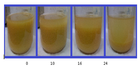 En la figura 4 se muestra una secuencia fotográfica del proceso de floculación durante la síntesis de la arcilla Borojo modificada con liquido iónico (sólido amarillo) con un tiempo de sedimentación final de 24 segundos. Asimismo, al añadir el líquido iónico se observó un aumento considerable del tamaño de las partículas así como una rápida sedimentación.