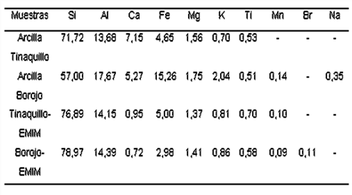 La composición química de las arcillas y de los sólidos sintetizados, se muestra en la Tabla 1. Principalmente, se puede notar una disminución en el contenido de calcio y sodio que presentaban inicialmente las arcillas Tinaquillo y Borojo, respectivamente. Esto como consecuencia del intercambio de estos cationes en las arcillas, por los cationes orgánicos EMIM + que conforman los líquidos iónicos.