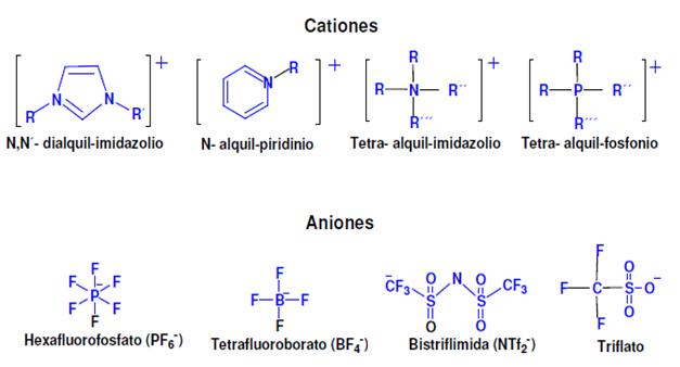 En la Figura 3 se muestran algunos de los cationes y aniones más comunes de los líquidos iónicos.