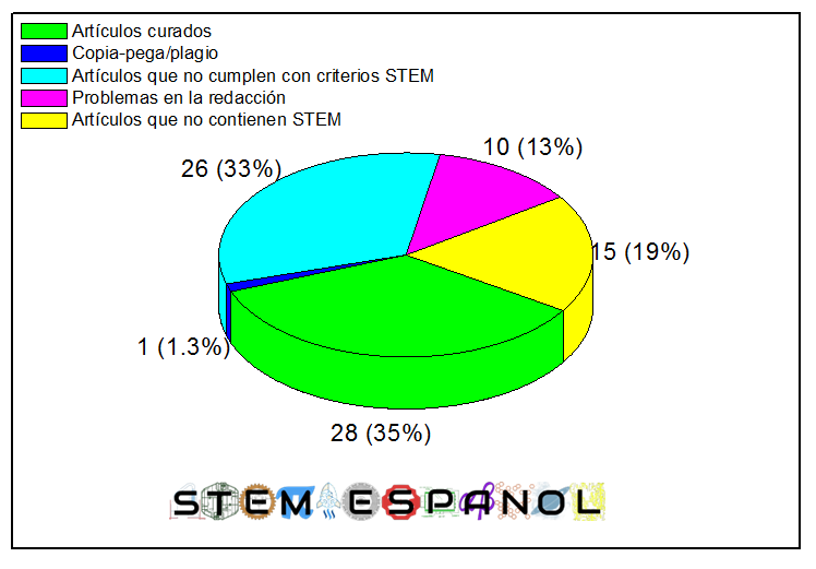 En resumen 80 artículos usaron la etiqueta #stem-espanol, de los cuales 28 recibieron el apoyo de STEM, con un 35%. El 65% restante se divide de la siguiente manera: 1.3% copia y pega texto de Internet sin modificar nada, 33% realiza un gran esfuerzo, pero no cumple con algunos de los estándares de STEM, 13% presenta graves problemas con la gramática y acentuación, y por último el 19% son artículos que no tienen relación alguna con #stem-espanol, es decir no contienen "STEM".