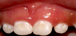 En los estadíos más tempranos, la lesión del diente aparece como una mancha blanca de superfifie porosa como "Tiza", con una superficie intacta donde la lesión de la sub-superficie es reversible. En niños menores de tres años, estas lesiones incipientes se observan por lo común en la superficie frontal de los dientes anteriores. Cualquier mancha blanca debe ser referida para la evaluación por un odontólogo.