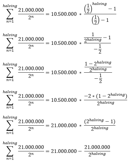 El protocolo bitcoin debe realizar 32 halvings antes de dejar de generar nuevos bitcoins, por lo tanto los puntos suspensivos se usan para abreviar todos estos resultados, la función mostrada anteriormente se puede generalizar mediante el uso de la siguiente serie finita: