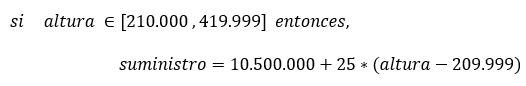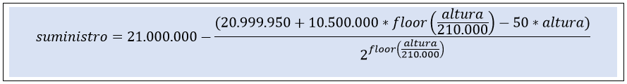 Lo cual corresponde a la recompensa que se genera aproximadamente cada 10 minutos al encontrar el bloque, teniendo en cuenta que los halvings suceden cada 210.000 bloques, se puede establecer la siguiente relación para calcular el suministro total de bitcoin en función de la altura de bloque antes de que ocurriera el primer halving:
