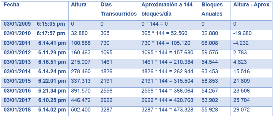 En la tabla anterior se observa la cantidad de bloques que han sido minados cada año, se puede apreciar que en los años 2009 y 2010 el ritmo de generación de bloques era un poco lento razón por la cual se generaban menos bloques de lo que estipula el protocolo, esto se debe a la poca cantidad de mineros que había en ese momento y al hecho de que muchos dejaban de minar al poco tiempo de comenzar, sin embargo, en los años posteriores se produjo un aumento considerable de la cantidad de mineros y por lo tanto de bloques minados, debido a esto para el 03/01/2018 la cadena de bloques estaba 29.072 bloques adelantada a lo que debería haber sido su ritmo natural de producción.