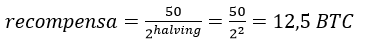 Visto desde esta perspectiva la recompensa por bloque tiende a reducirse con el tiempo, la siguiente ecuación permite calcular la recompensa por bloque dependiendo de cuantos halvings hayan sucedido.